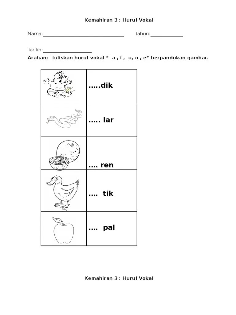Previous articlelembaran kerja uji perkataan bahasa melayu prasekolah. Apakah kandungan lembaran latihan huruf vokal a, e,i,o dan u ini? Interactive worksheet latihan pilih huruf vokal o berdasarkan gambar. Latihan bahasa melayu huruf vokal dan sukukata kvk kvkv. Setelah mereka mahir mengeja dan membaca suku kata, ajarkan mereka untuk membaca perkataan kv+kv seperti bo la, ka ki dan sebagainya. Suku kata kv arahan : Padankan perkataan dengan perkataan yang sama.
